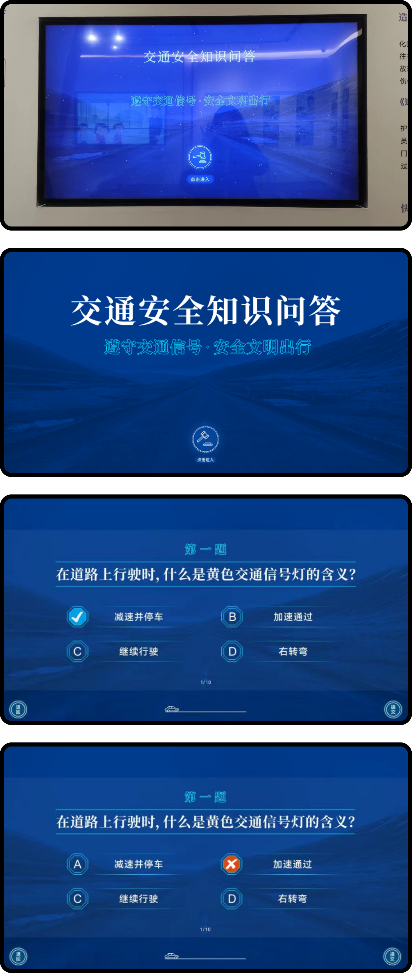 点击屏幕,出现知识问答选出正确选项,最后会得出分数。